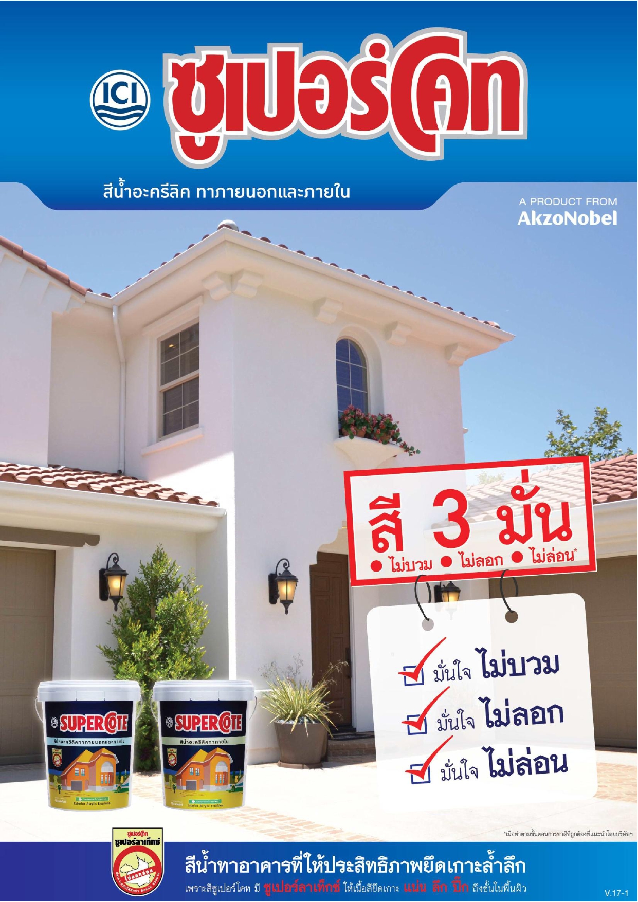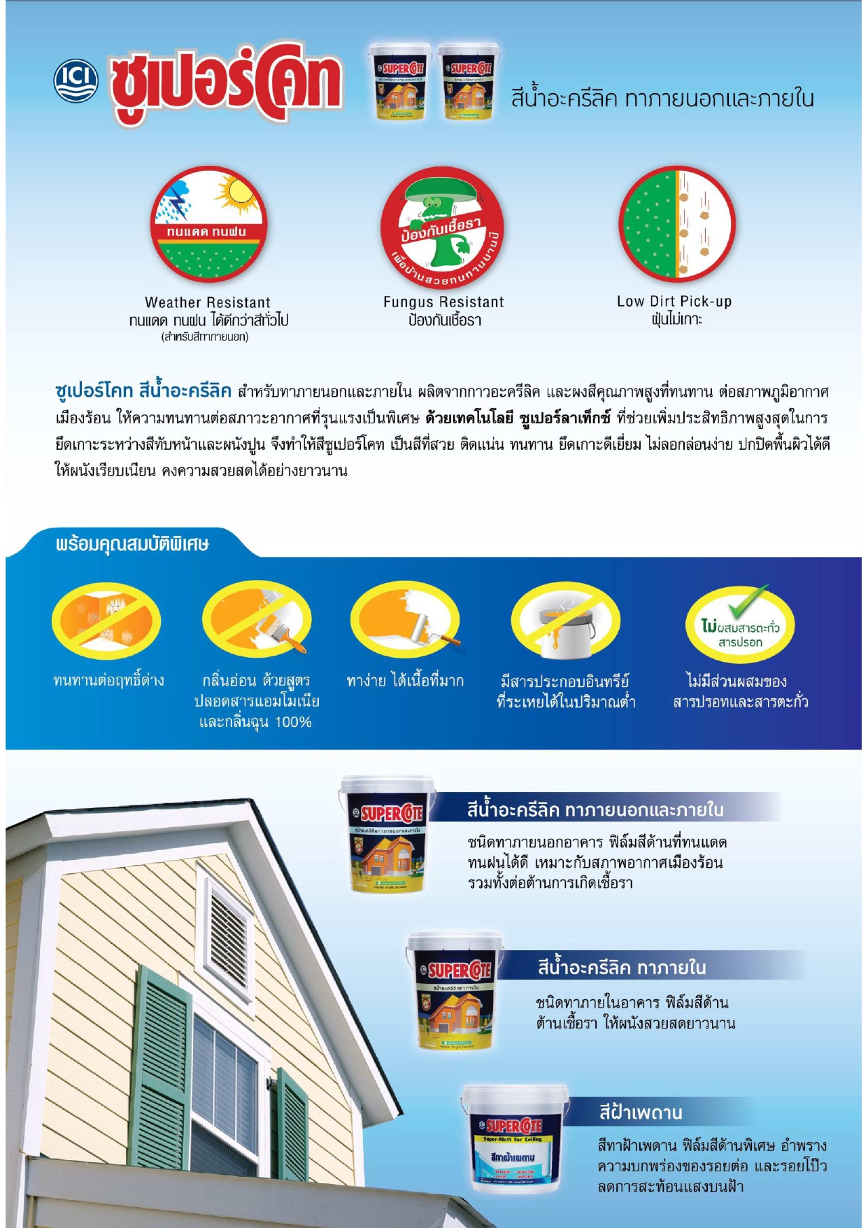 สีซูเปอร์โคท สำหรับทาภายใน ผลิตจากอะครีลิคคุณภาพสูง ยึดเกาะแน่น ด้วยเทคโนโลยีของซูเปอร์โคท ซูเปอร์ลาเท็กซ์ ที่